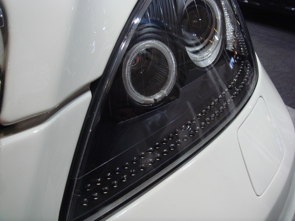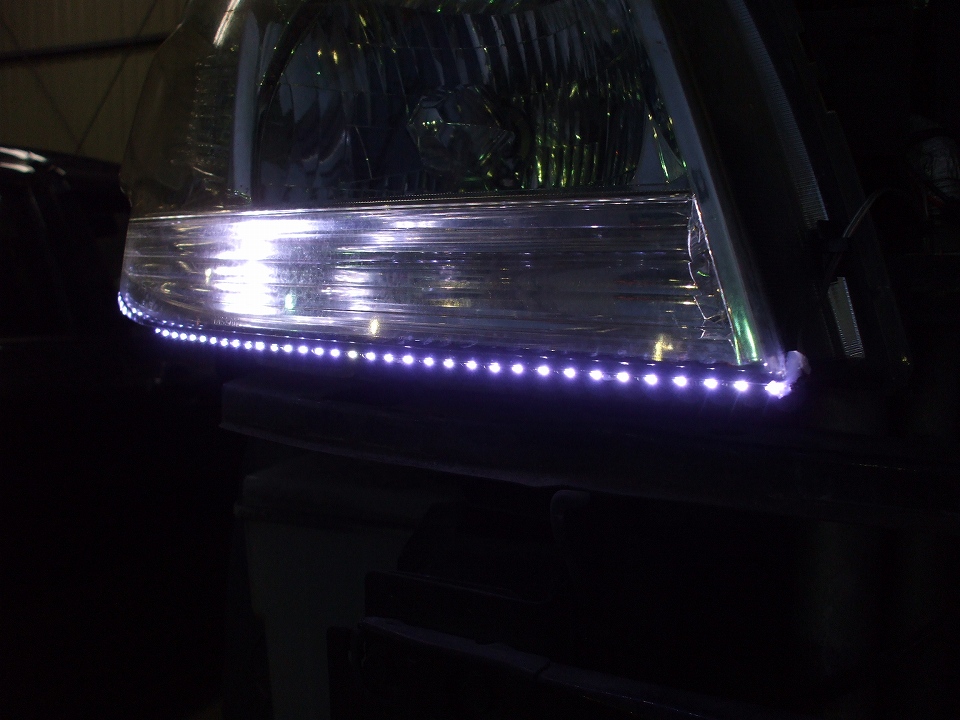 コイツをヘッドライトケースのRに合わせて貼り付けます。この製品は、ゴムの中にLEDが一列に封入されています。なので、フニャフニャと曲がります。